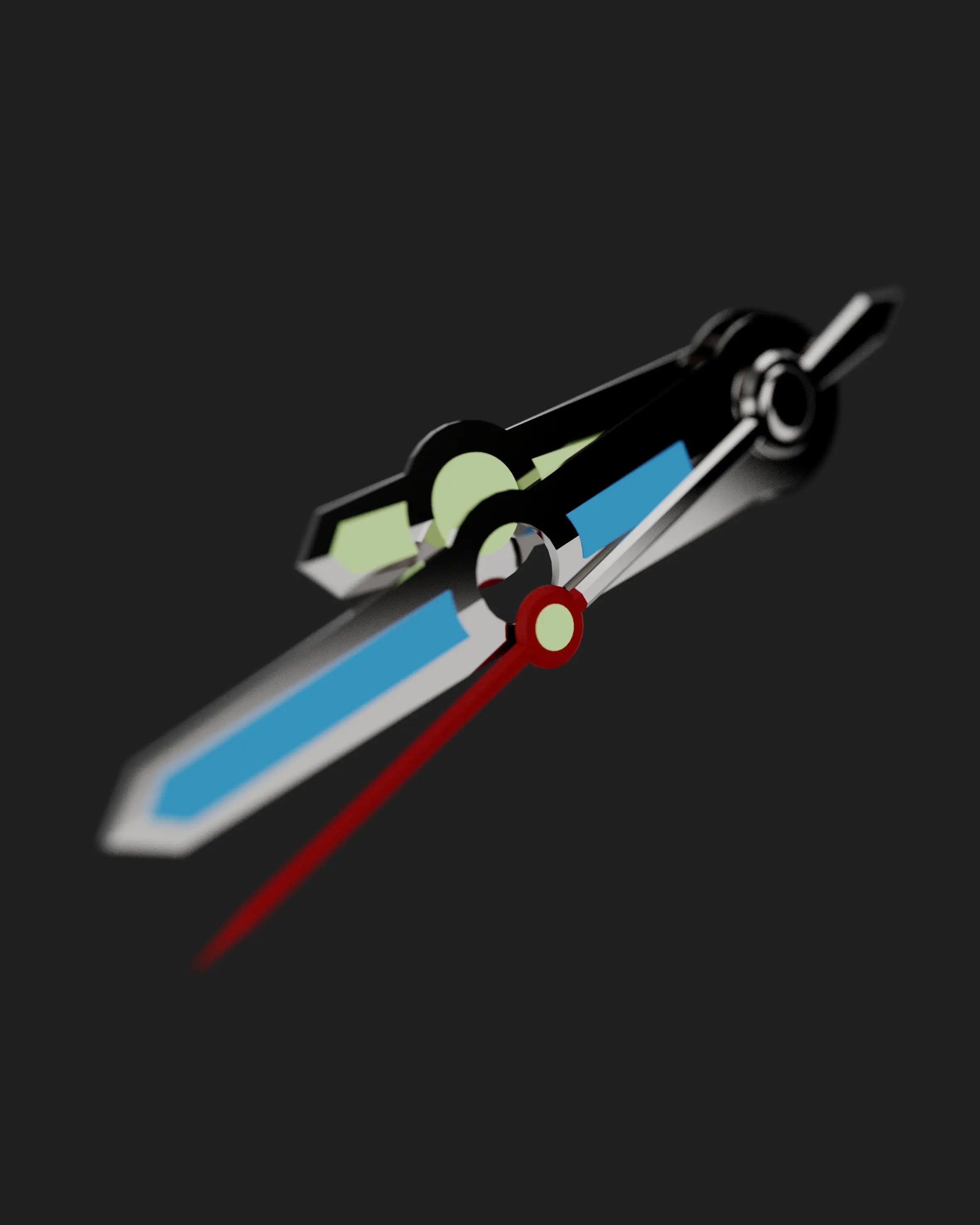 Experience the pinnacle of horological ingenuity with our signature facetted hand set, a masterclass in precision and design. Engineered for seamless legibility, the minute hand features a concentric aperture that elegantly reveals the hour hand beneath it every 60 minutes, ensuring uninterrupted timekeeping clarity. Every detail is harmonised: the luminous dot on the sleek second hand aligns perfectly above both hands, creating a hypnotic symmetry that’s as functional as it is visually captivating.
