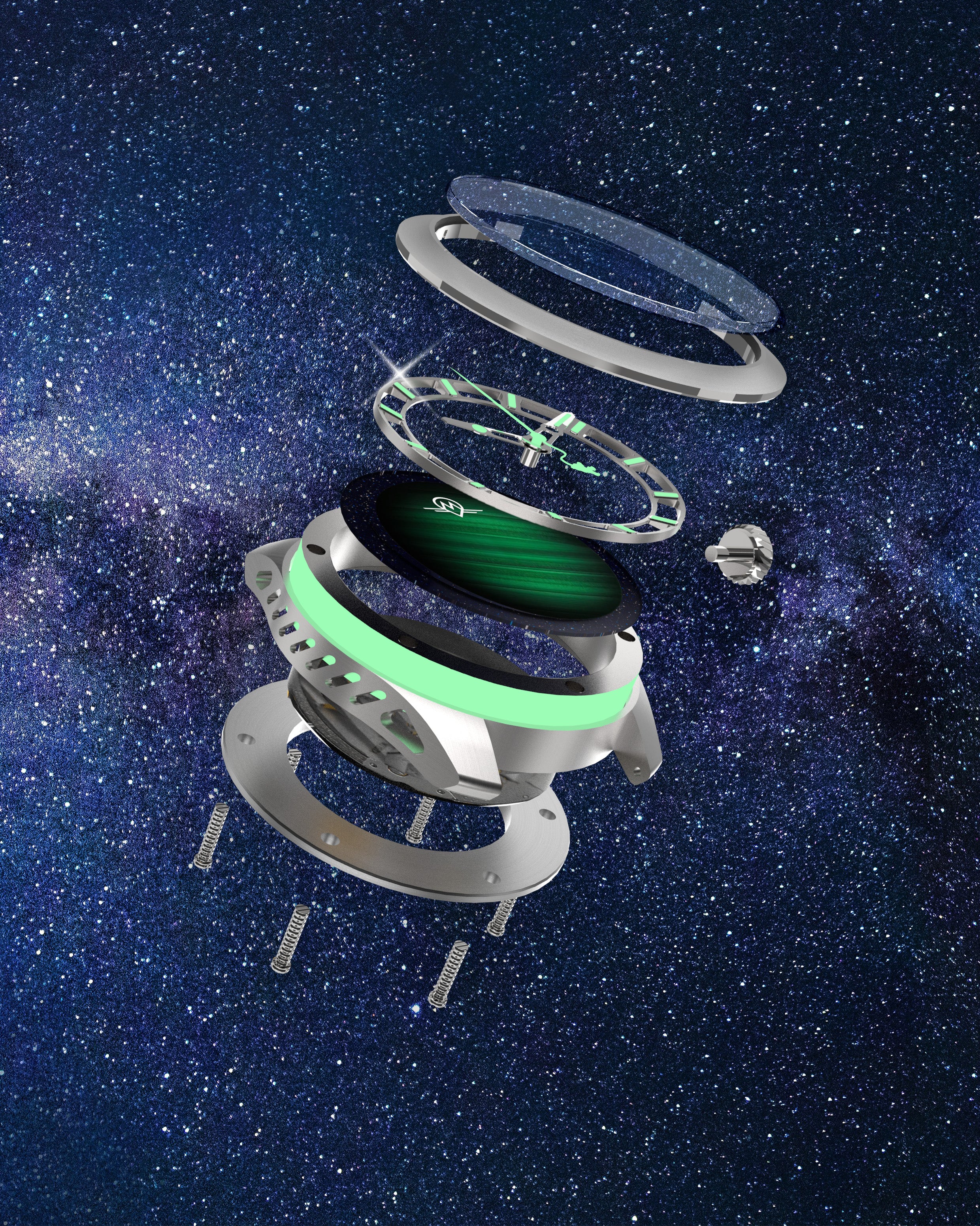 The dials are made in two separate materials with the cosmic beauty of Aventurine on the outer with the 'window' index ring above it and a galaxy of semi-precious dials treated with a fumé gradient finish to represent the spherical appearance of planets for the inner dial.