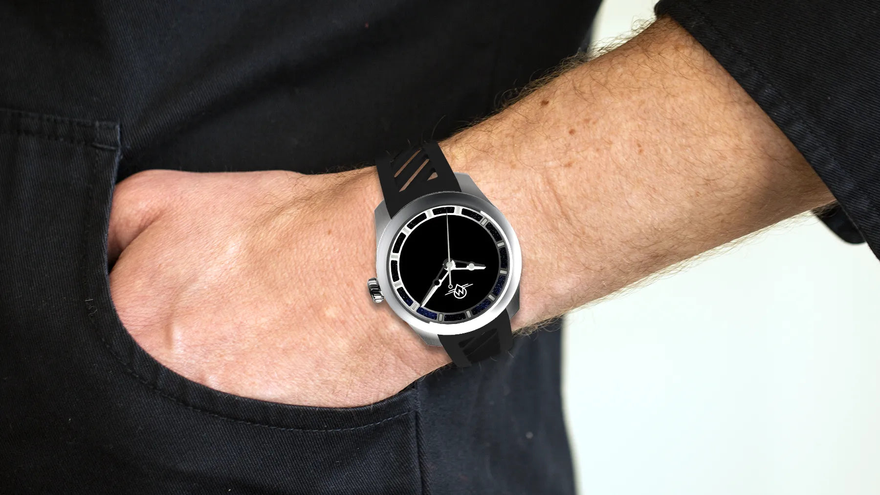 Introducing the Black Hole featuring a the Musuo black central dial absorbing 99.4% light, framed against a cosmic ring of Aventurine.