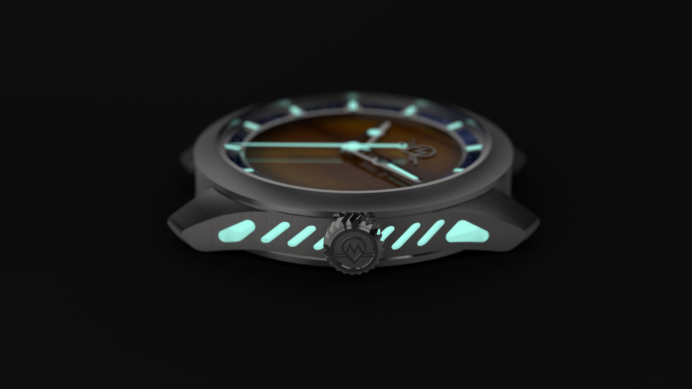 Dial Finish: 3 Piece Dial: Planet made of Tigers Eye with Gradient Effect and Applied Logo, Outer Space made from Aventarine, and Brushed Cage with 12 Indexes