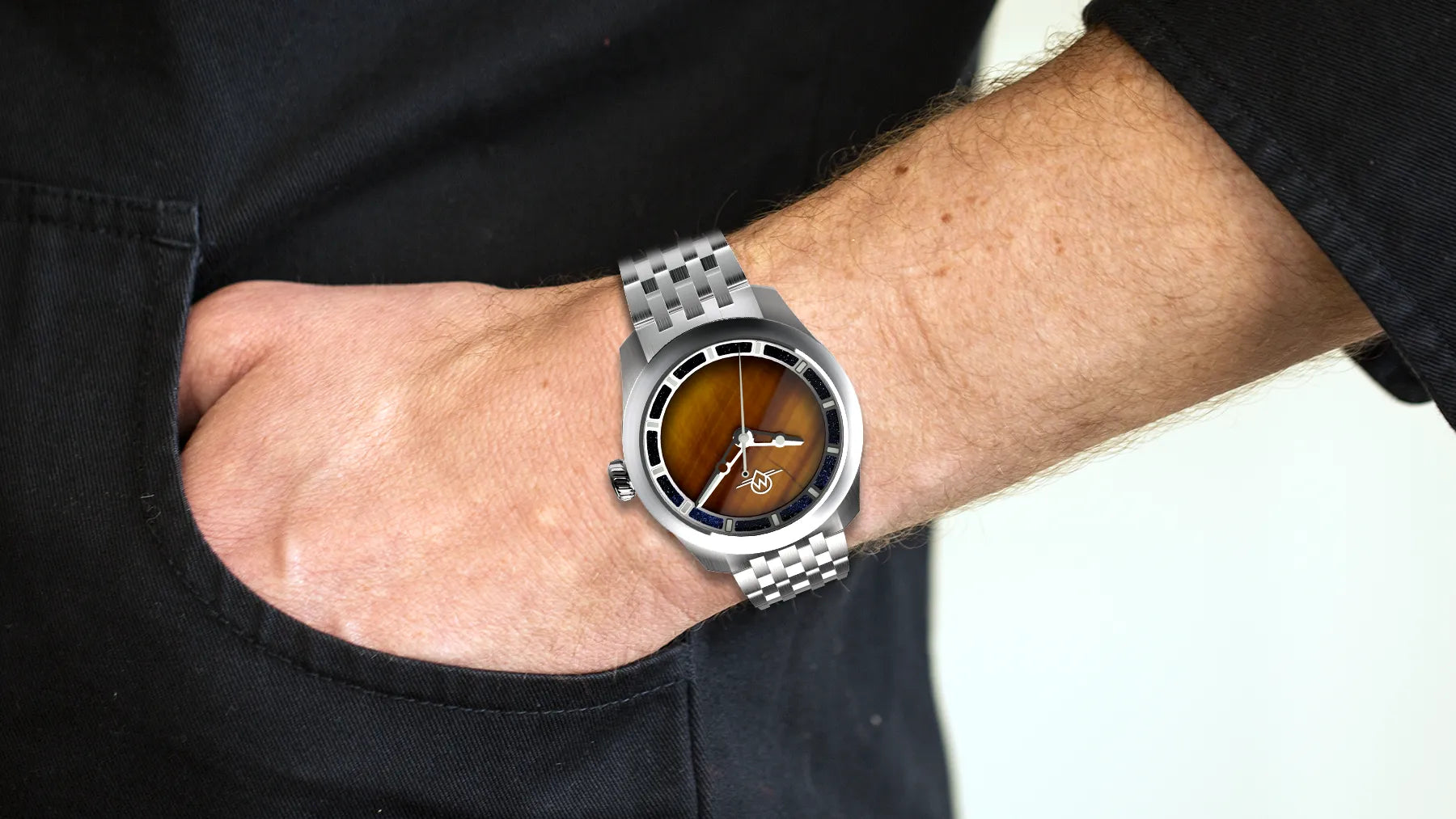 Introducing the Planet Tiger's Eye featuring a genuine, semi-precious Tiger's Eye stone central dial with gradient fumé finishing, framed against a cosmic ring of Aventurine.