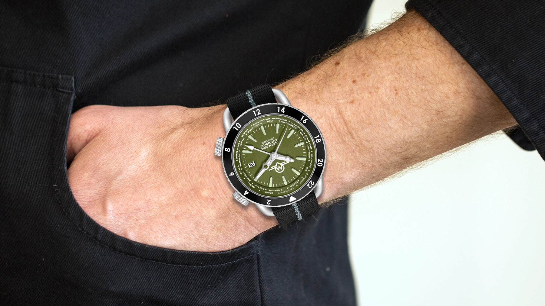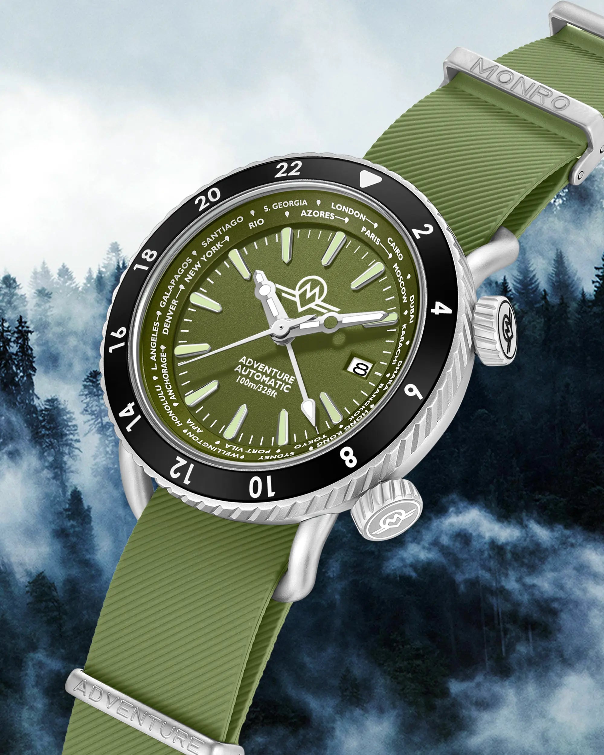 MONRO ADVENTURE MA-4 WOODLAND GREEN, Automatic GMT Worldtimer, 44mm Stainless Steel, Green Dial