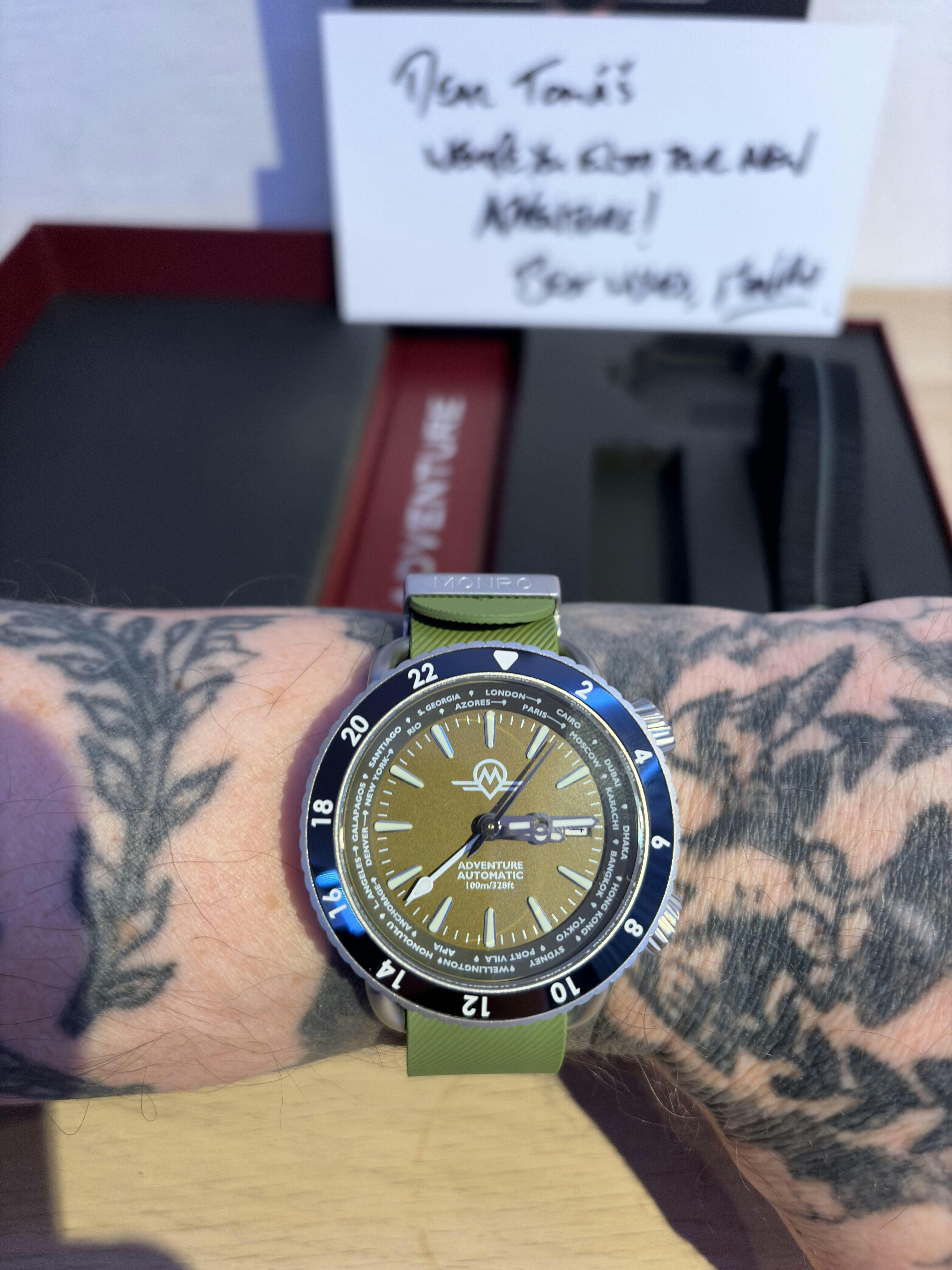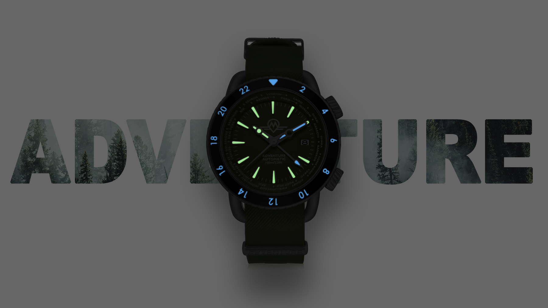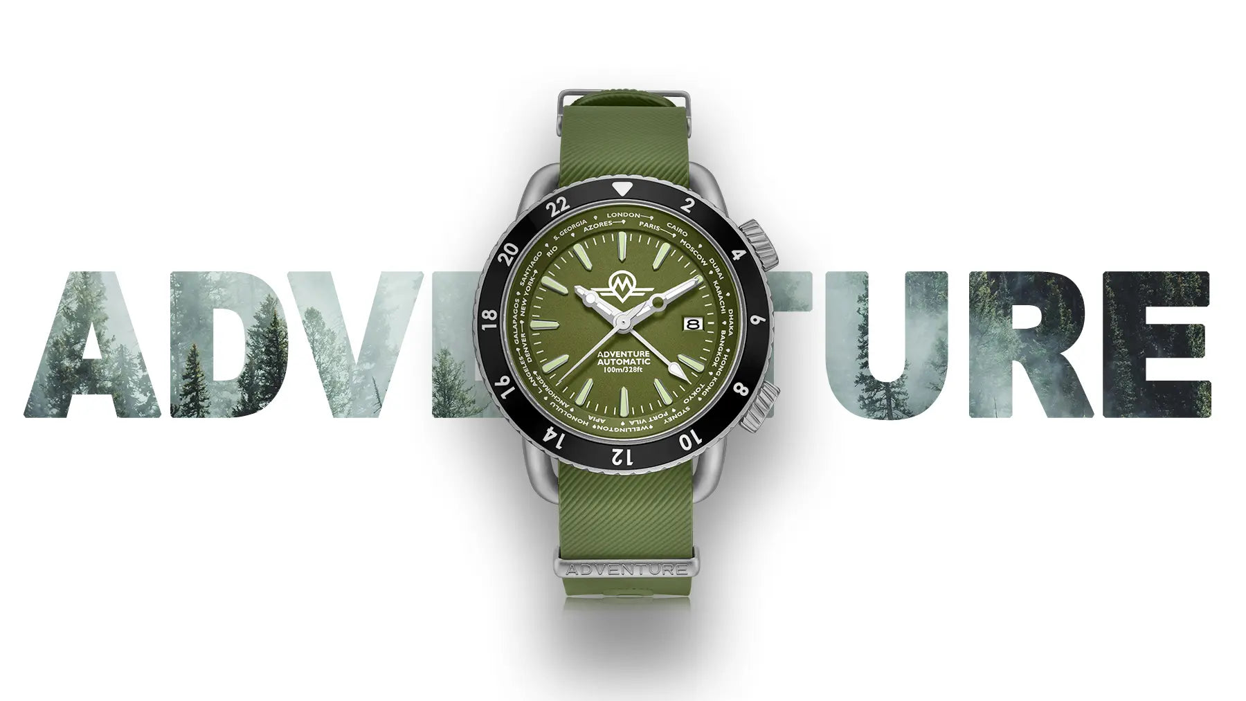 Designed in-house MONRO ADVENTURE is a multi-functional, automatic GMT watch that allows you to tell the time in 24 destinations around the world, go diving to 100m and change between its two straps straight out of the box.