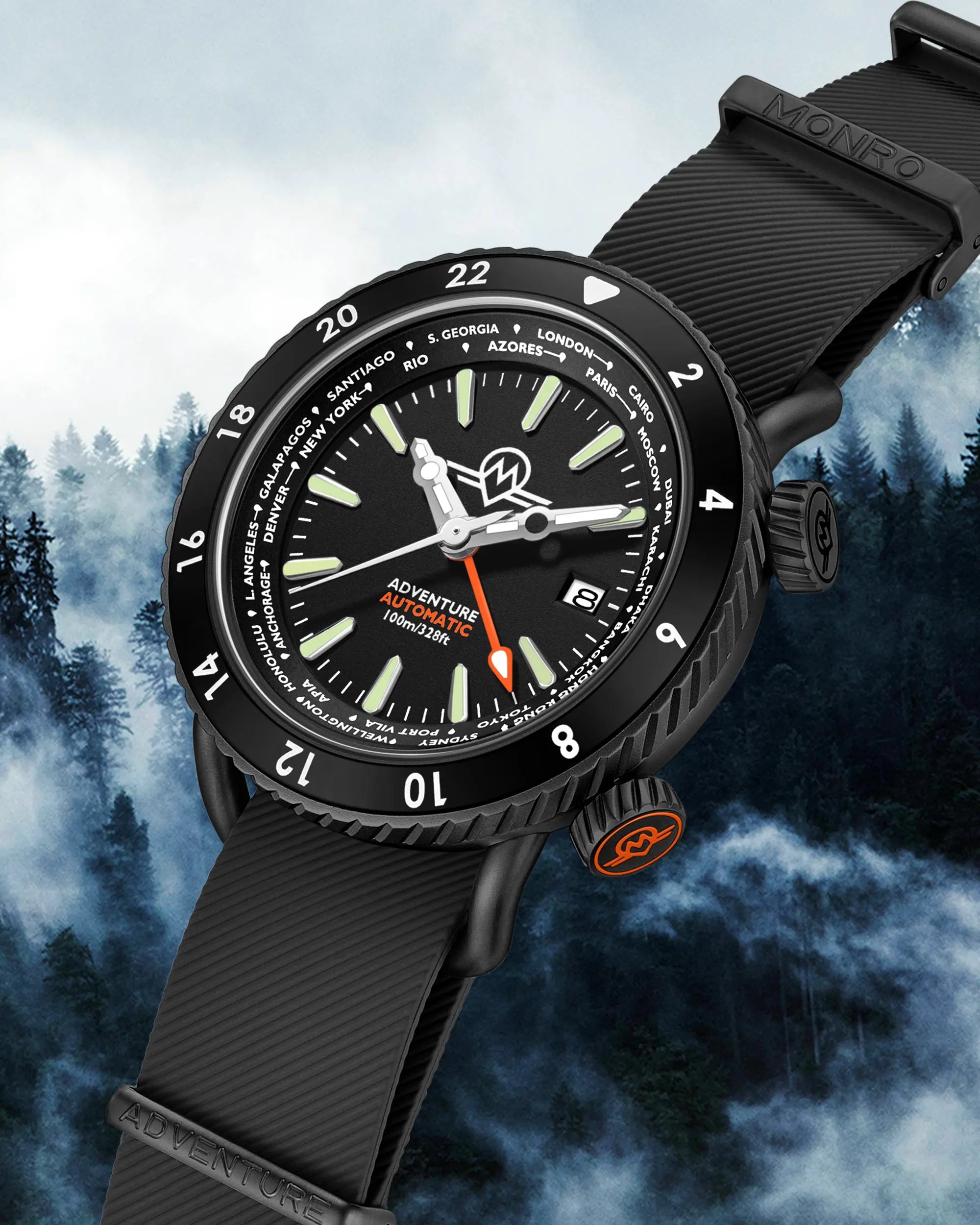 Designed in-house MONRO ADVENTURE is a multi-functional, automatic GMT watch that allows you to tell the time in 24 destinations around the world, go diving to 100m and change between its two straps straight out of the box.