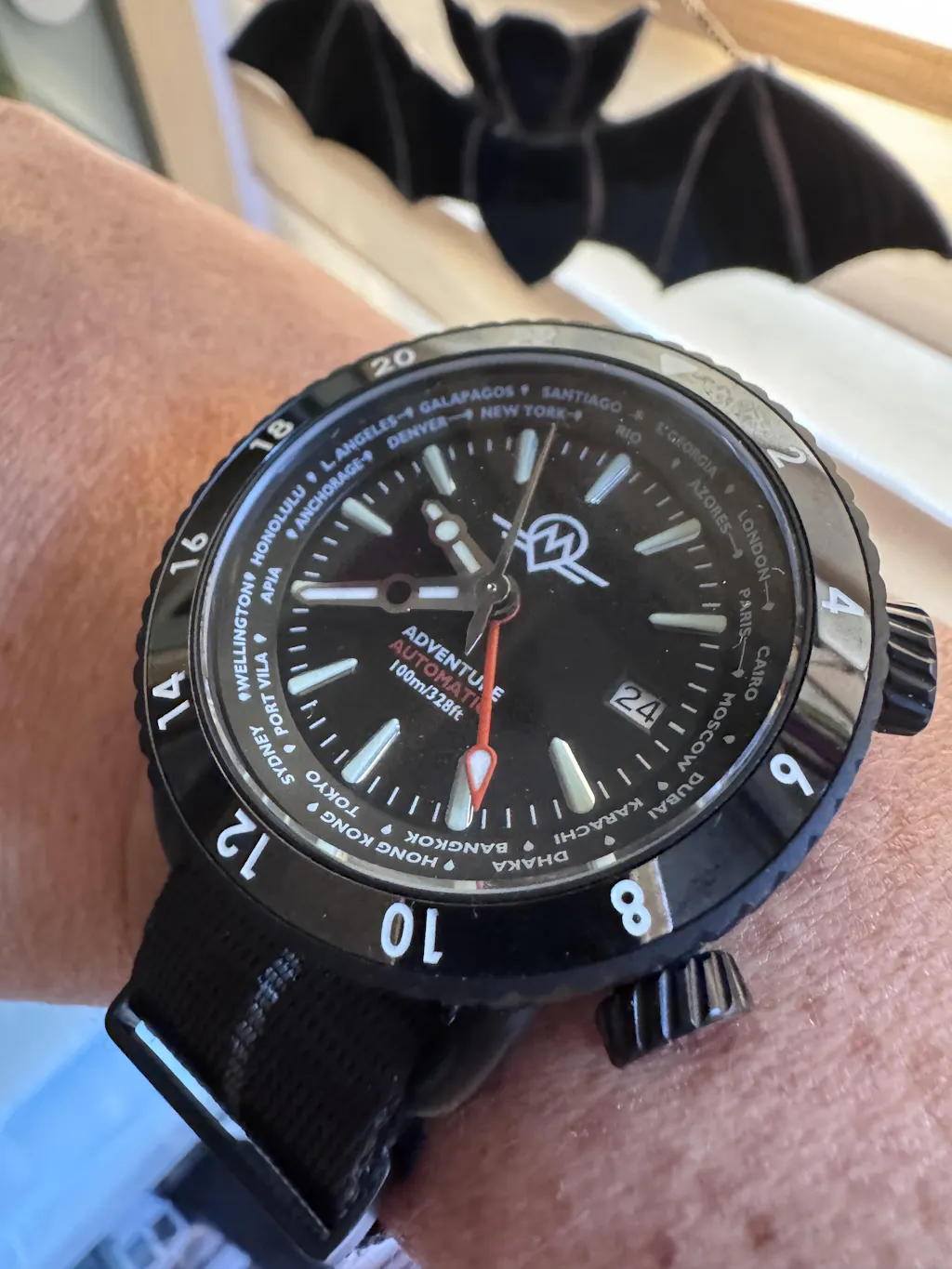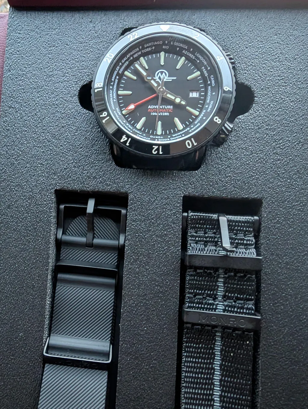 Stainless Steel 316L, automatic GMT world timer watch. Presented with two military style straps in NBR rubber and nylon