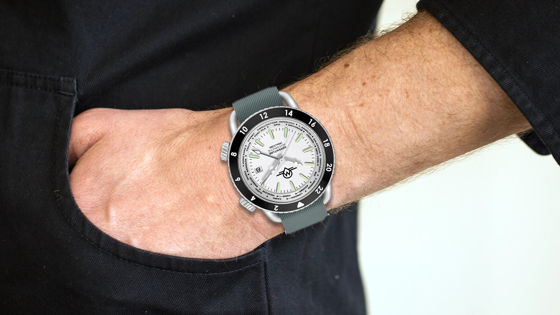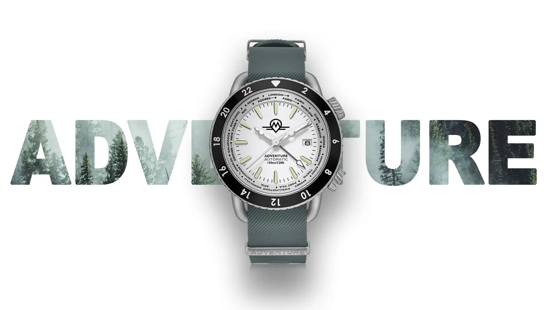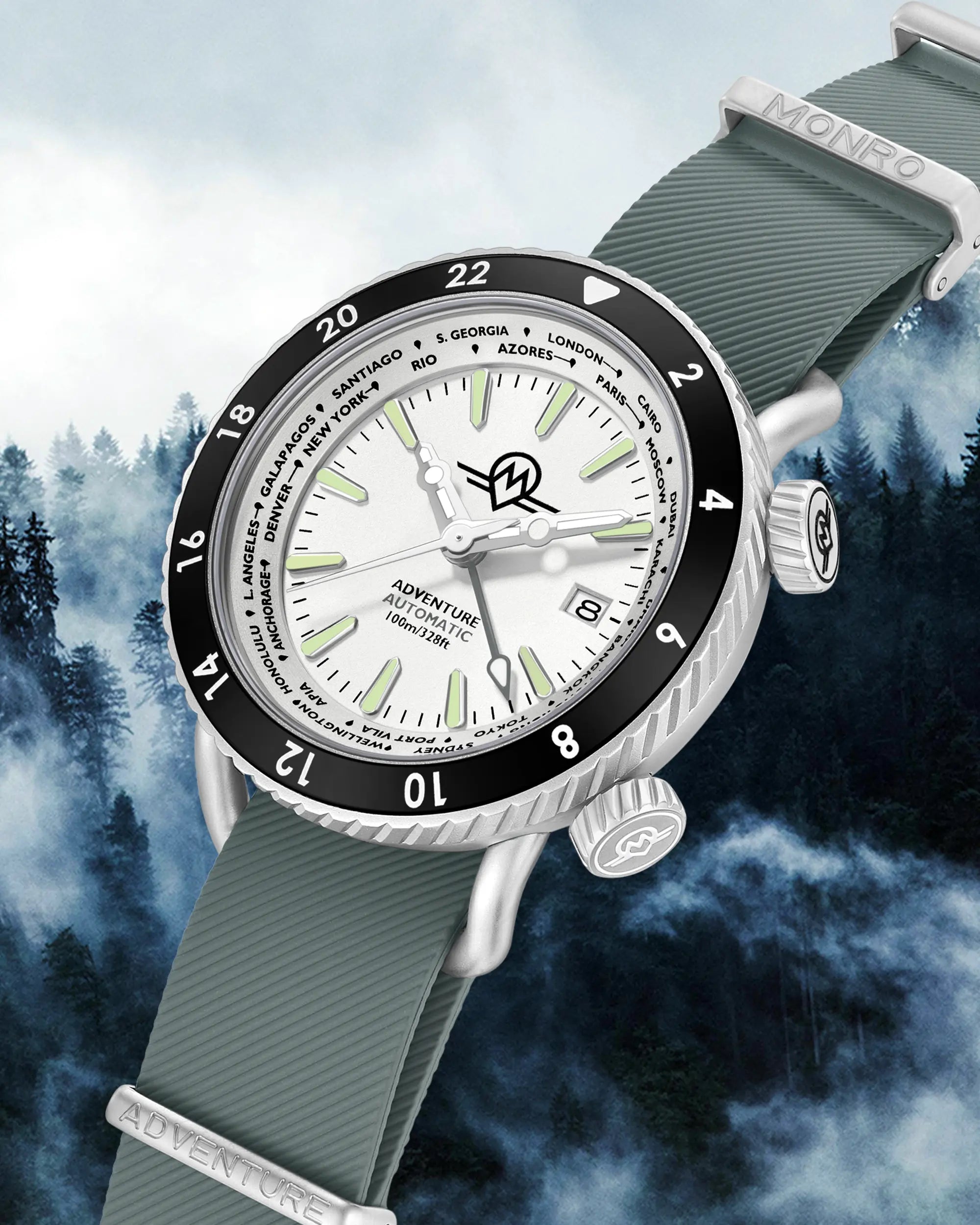 Designed in-house MONRO ADVENTURE is a multi-functional, automatic GMT watch that allows you to tell the time in 24 destinations around the world, go diving to 100m and change between its two straps straight out of the box.