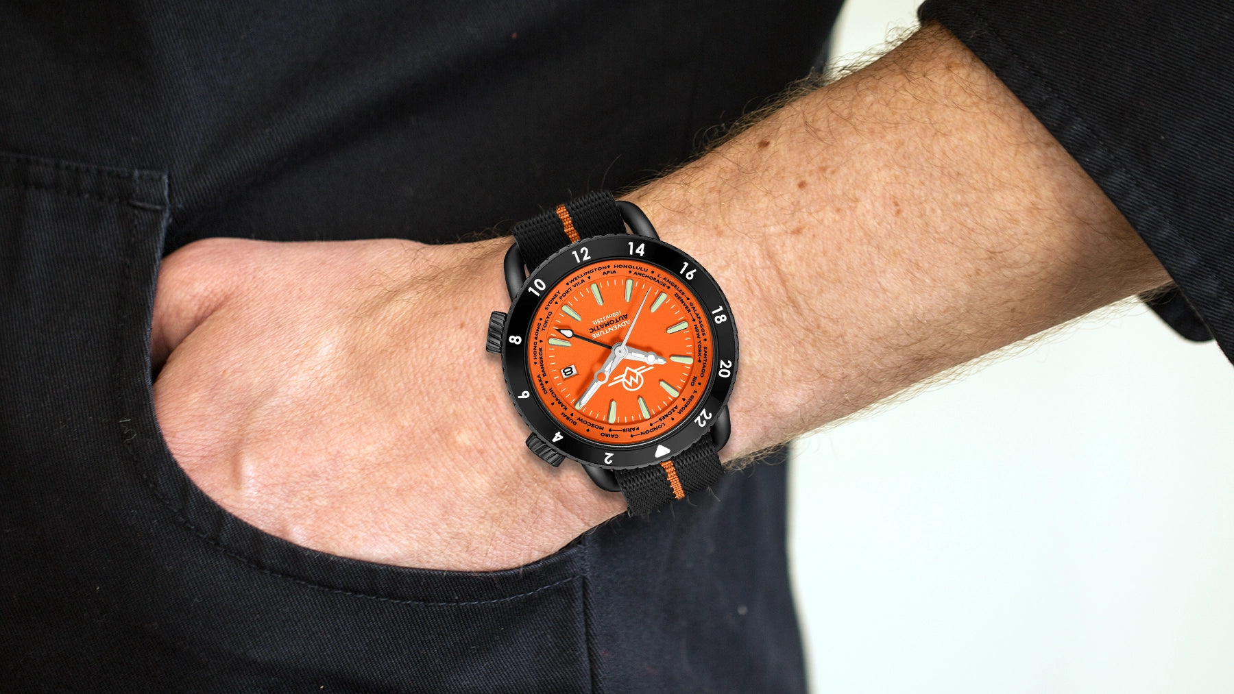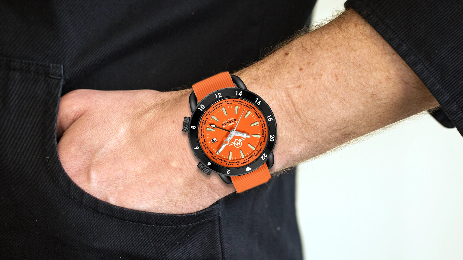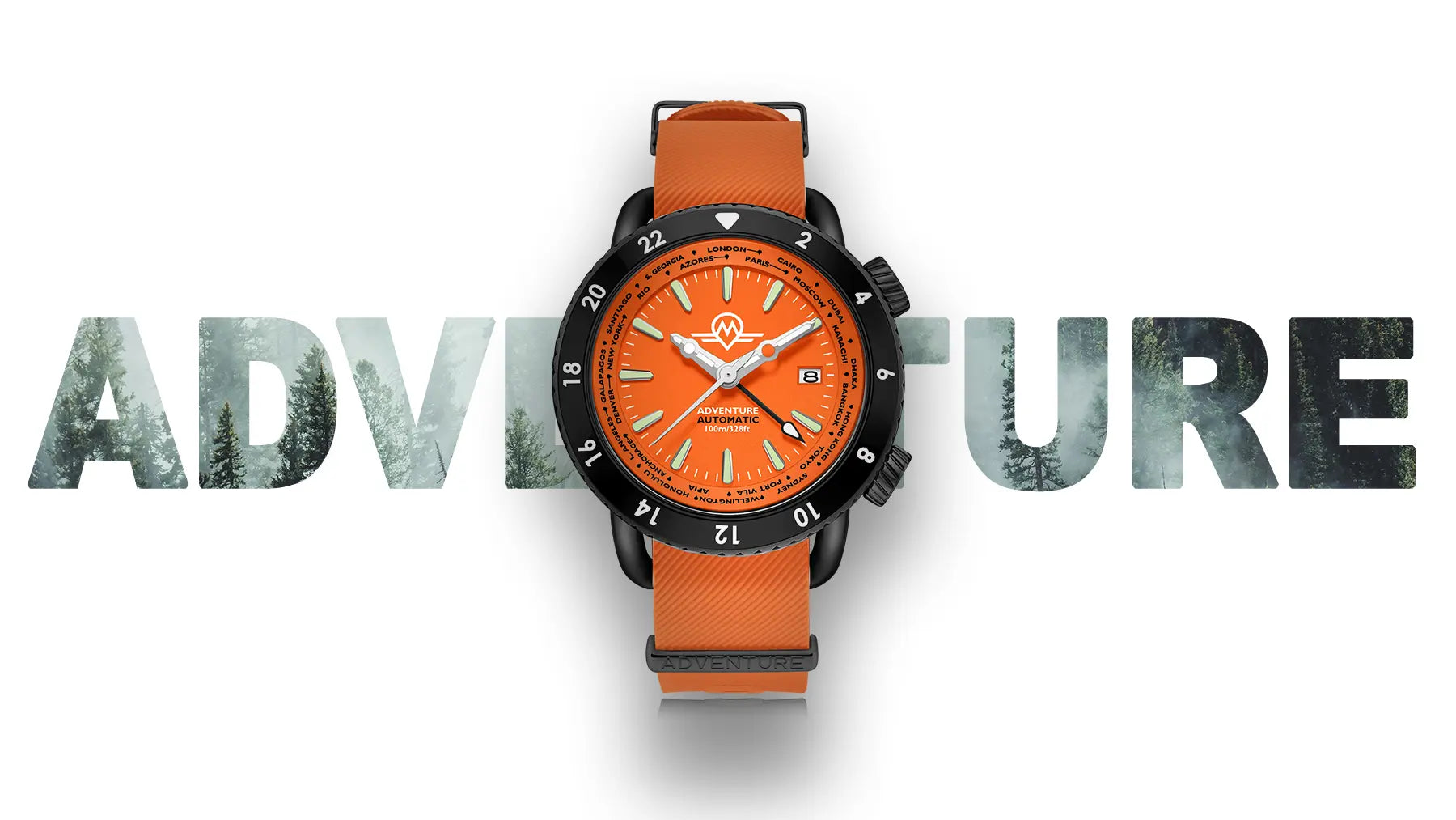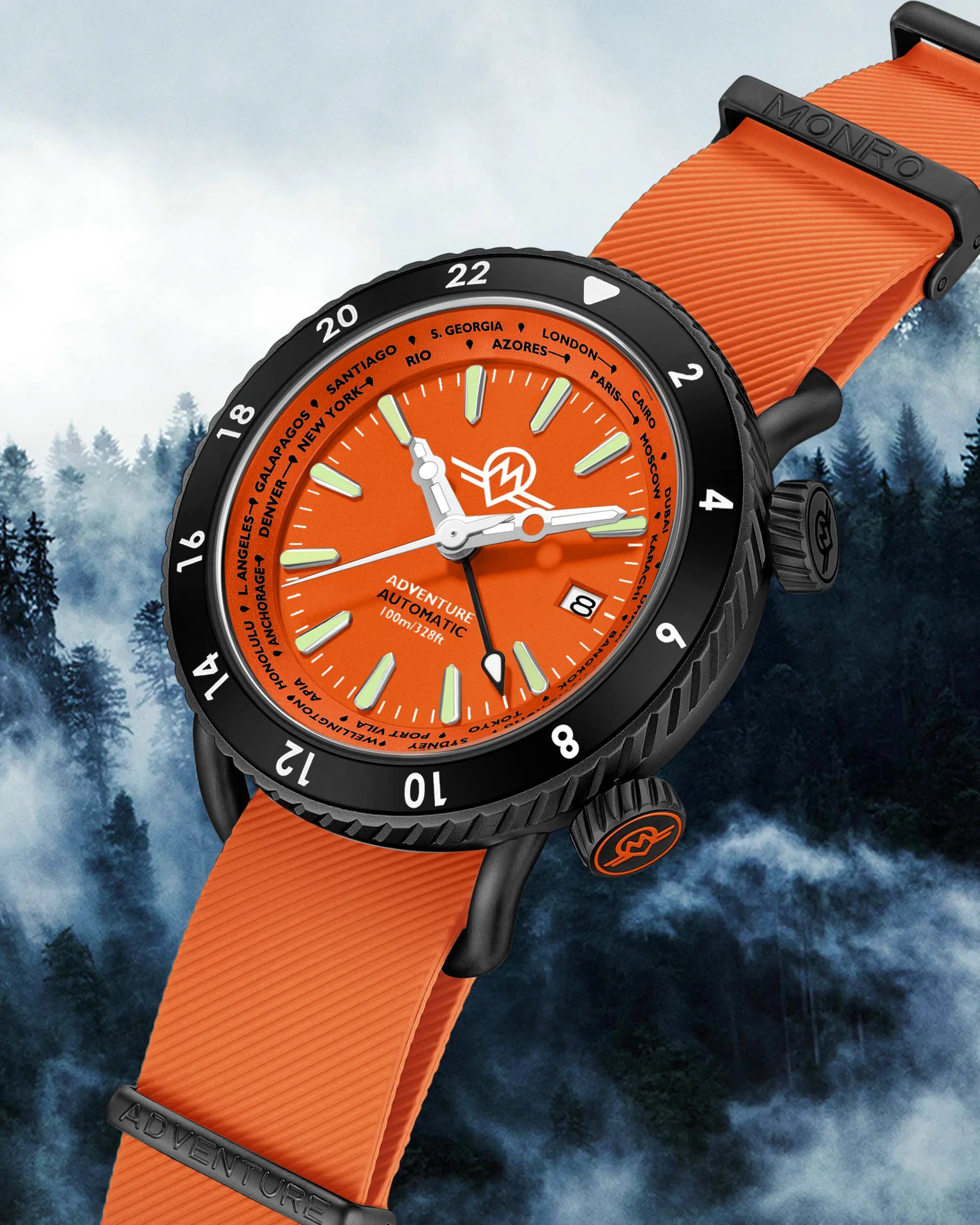 Designed in-house MONRO ADVENTURE is a multi-functional, automatic GMT watch that allows you to tell the time in 24 destinations around the world, go diving to 100m and change between its two straps straight out of the box.