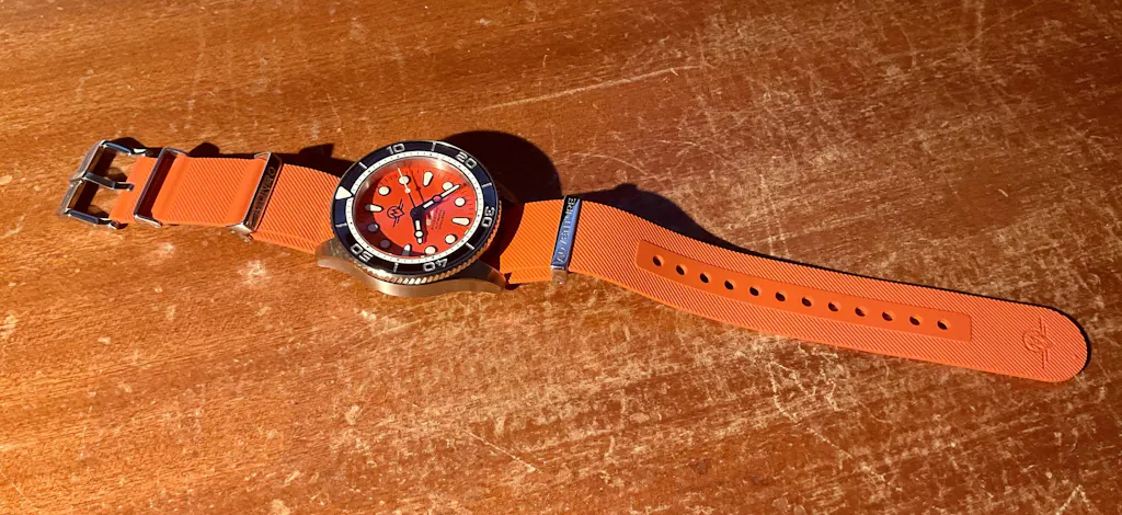 Stainless Steel 316L, automatic dive watch with 200m water resistance. Presented on a quick-release tapered bracelet with OTF micro-adjustment clasp and a NBR rubber military style strap.