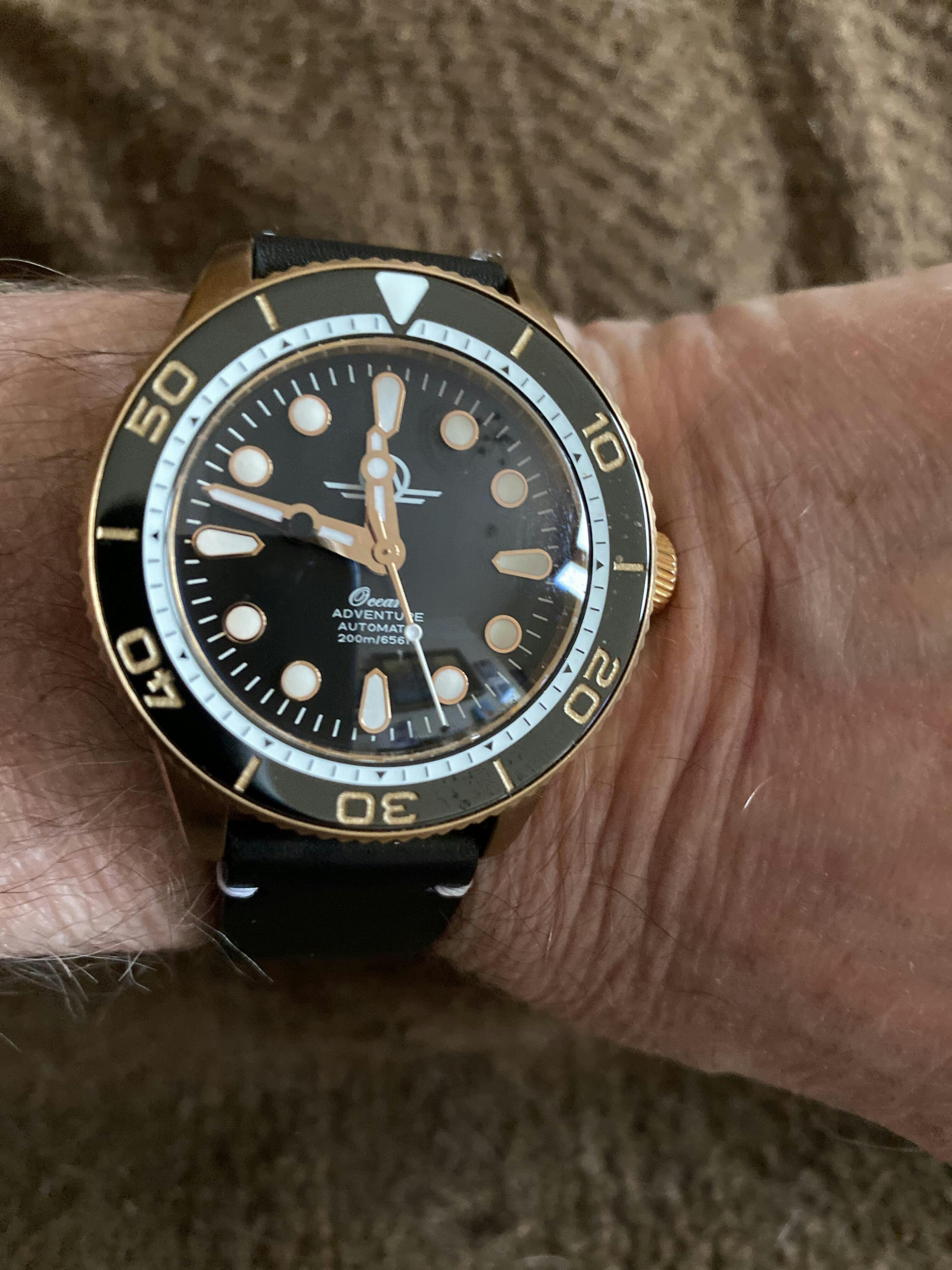 Solid Bronze CuSn8, automatic dive watch with 200m water resistance. Presented on a quick-release tapered leather strap and a NBR rubber military style strap.