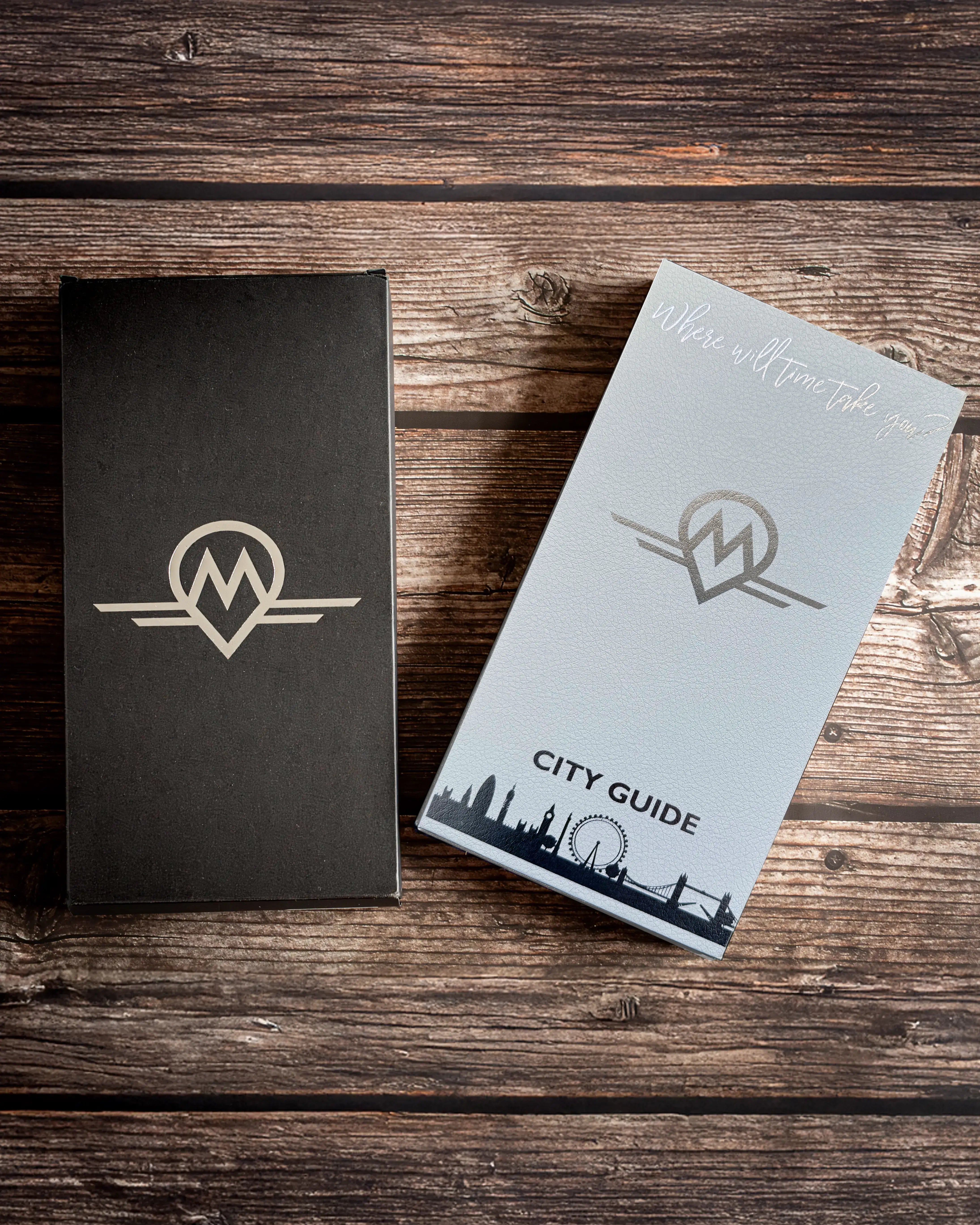 Encased in a FSC approved, recycled paper box in a rich grey leather grain finish with silver foiled detail, the case and two straps are securely fitted in a soft black eco friendly EVA material ensuring complete protection for its Adventure.