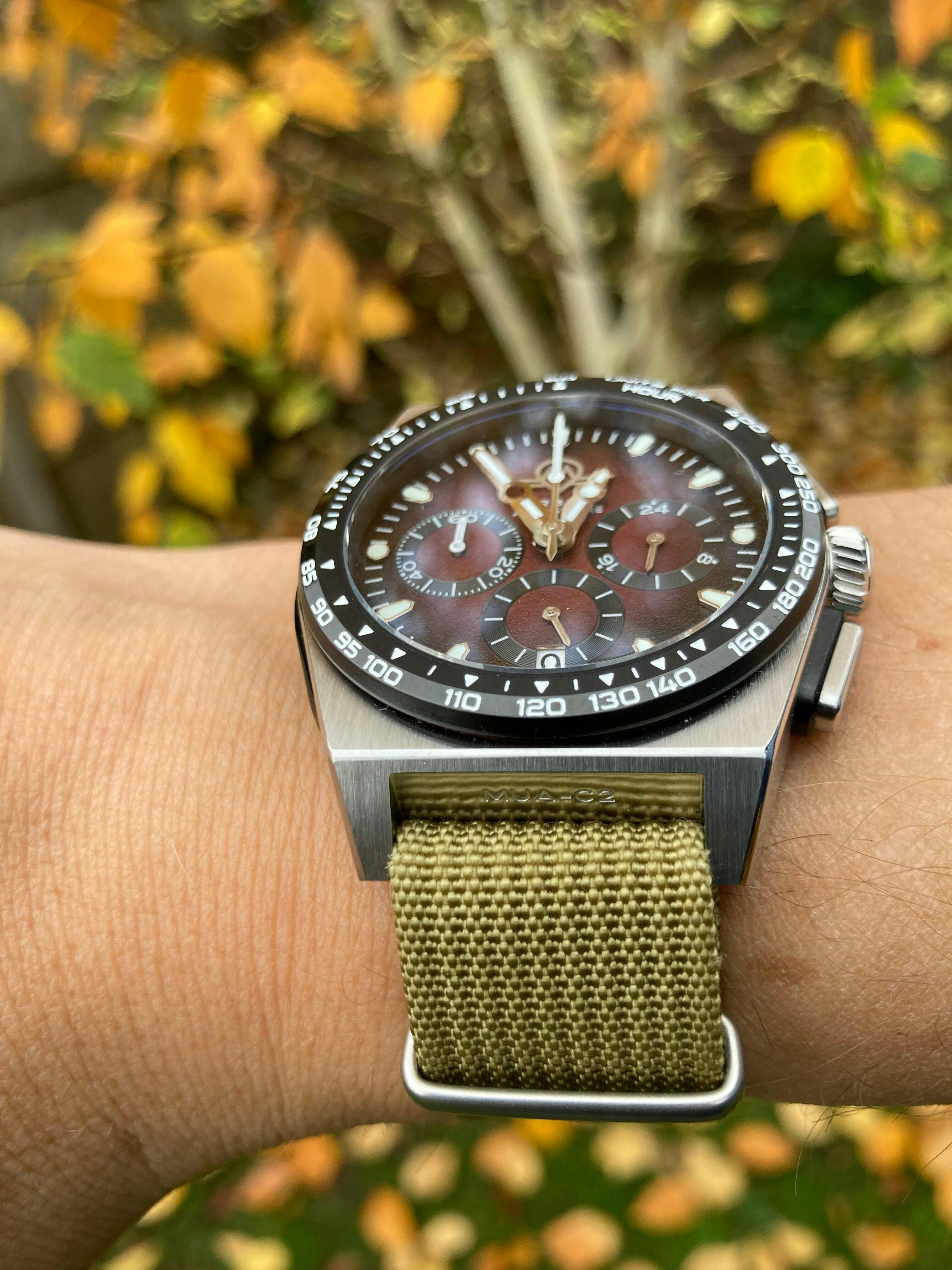 Individually numbered, limited to just 100 pieces. Stainless Steel 316L, integrated sports watch with mechaquartz chronograph movement. Presented on a quick-release tapered bracelet with deployment clasp and a NBR rubber military style strap.