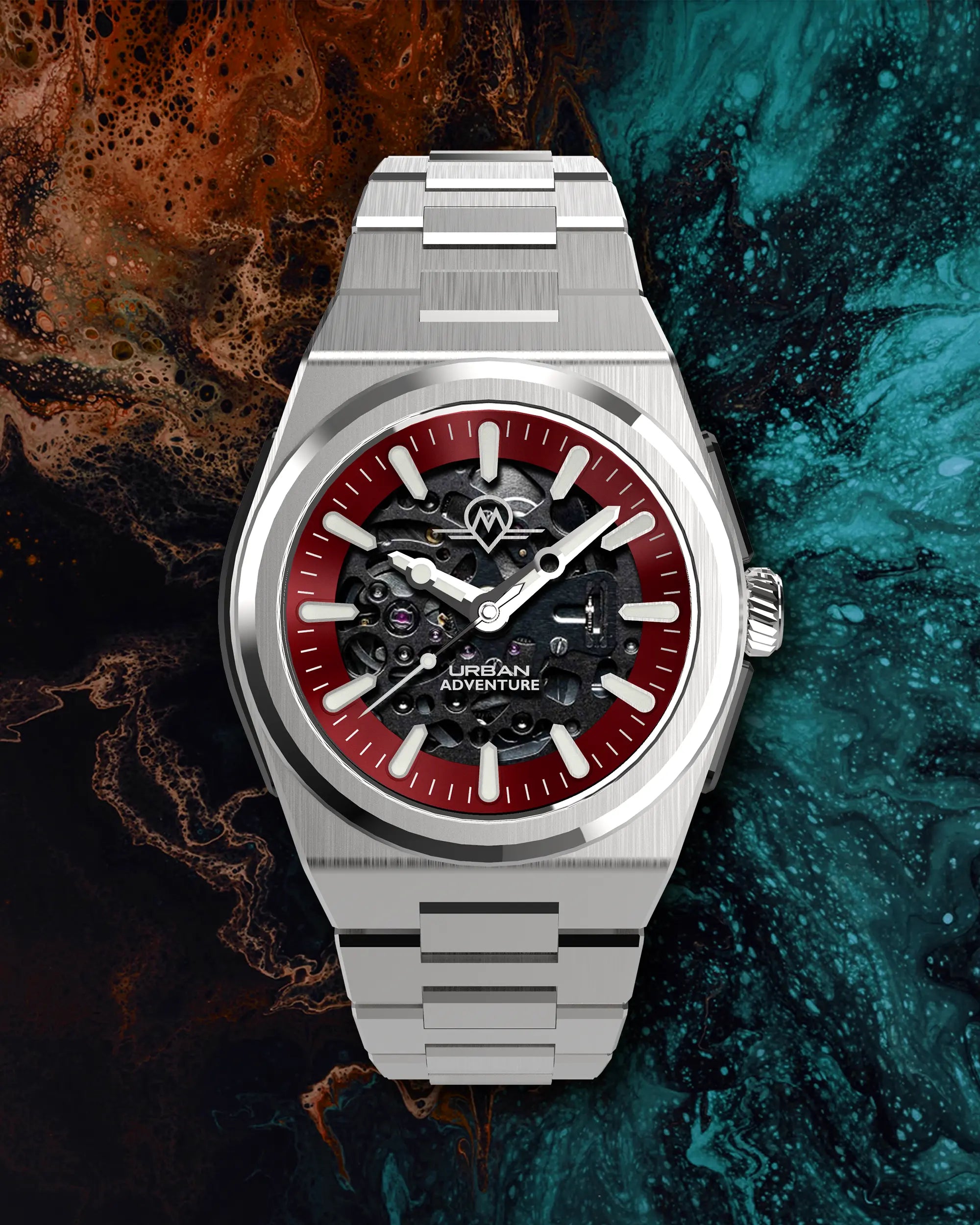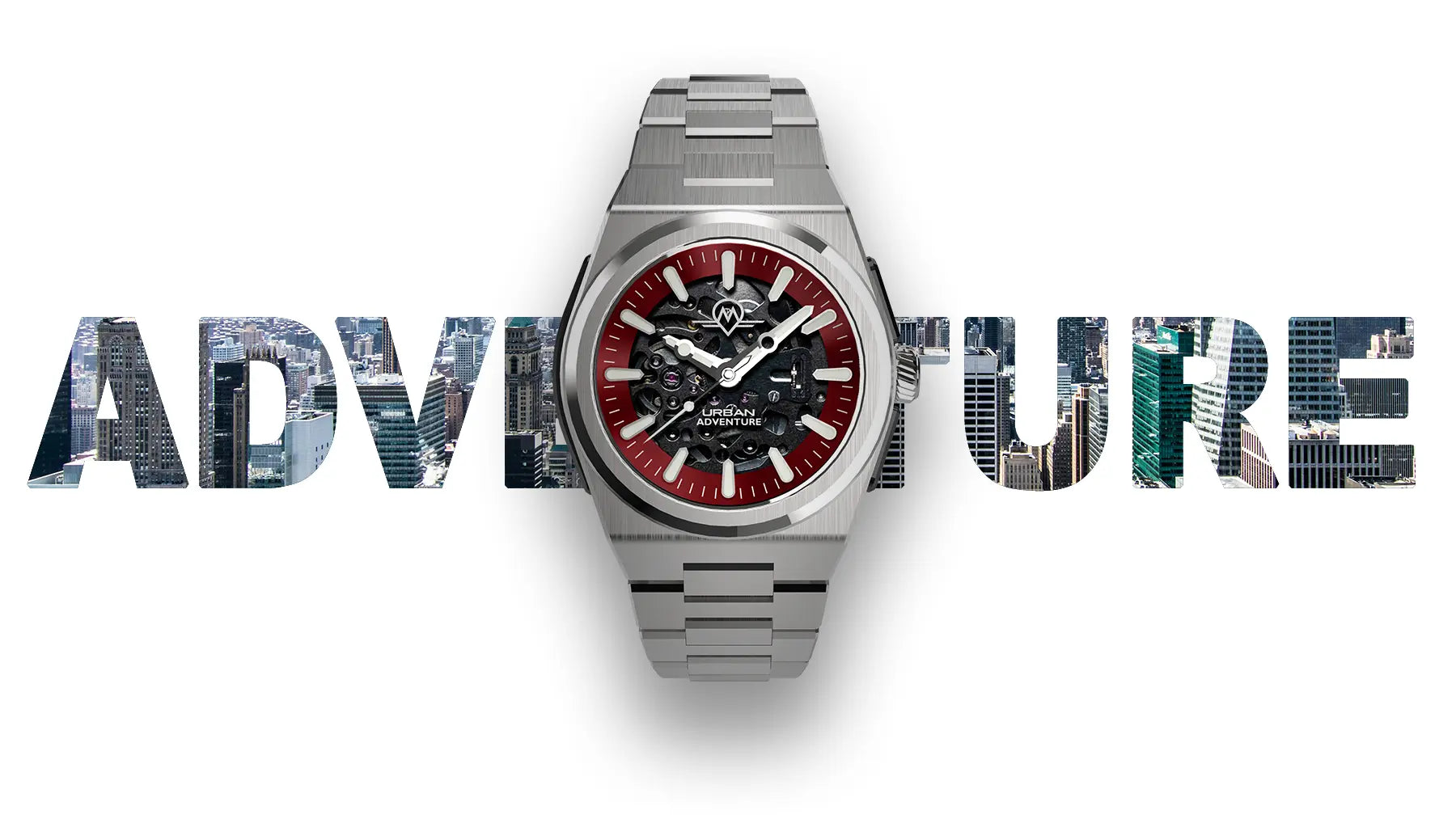 MONRO URBAN ADVENTURE MUA-S2, Automatic Skeleton, 40mm Stainless Steel, Red Dial